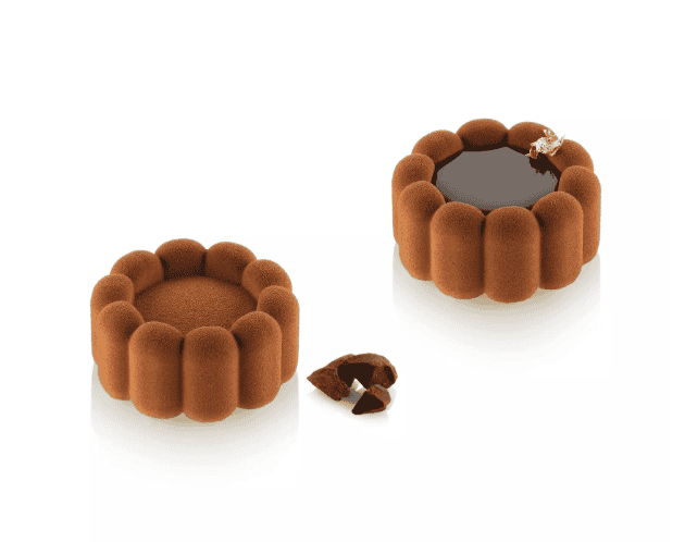 Charlotte 100 is the silicone mould designed to add a touch of refinement to every creation. With a single mould, you can make 6 single portions of 100 ml, inspired by the iconic shape of the classic charlotte, reinterpreted in a modern way. Made of high-quality silicone, Charlotte is versatile and functional: perfect for both chilled and baked preparations. Its surface also allows the use of velvet-effect spray, ensuring impeccable results. Thanks to the central cavity, each dessert becomes a canvas to personalise with sauces, fresh fruit, gelées or creative decorations. Dimensions: ø70 h 33 mm – Volume: 100 ml